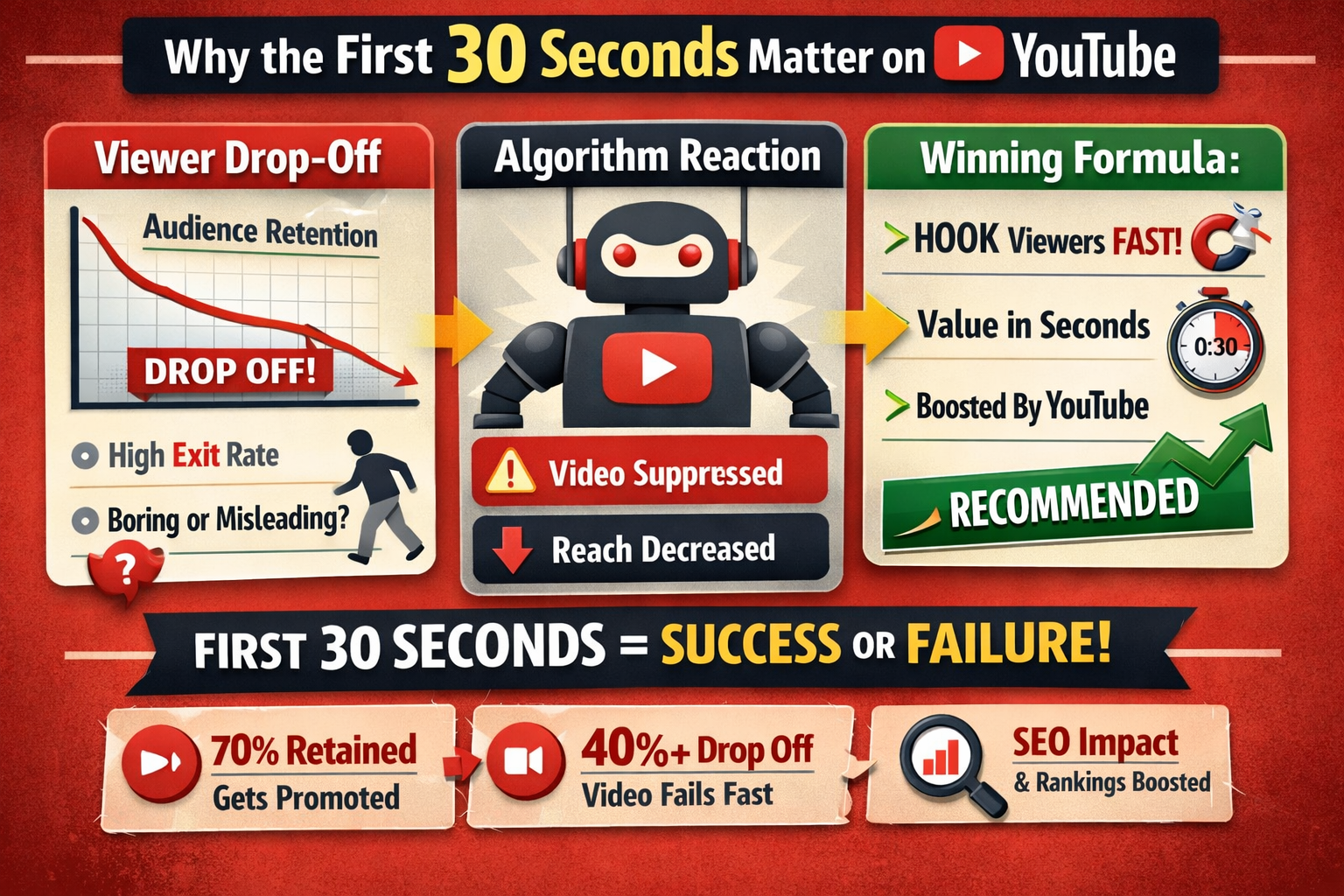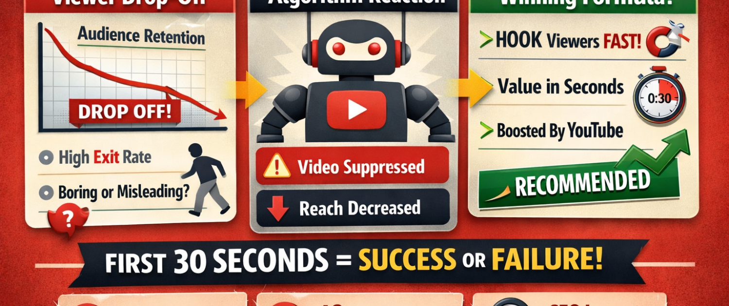 - The First 30 Seconds Now Decide Everything on YouTube — YouTube algorithm 2026YouTube algorithm 2026 : YouTube’s Most Critical Window Has Shrunk On YouTube today, success or failure is often decided before a viewer settles in. The first 30 seconds of a video now play a decisive role in how far that content travels. Whether a video reaches 1,000 views or 1 million increasingly depends on what happens immediately after the play button is pressed. This shift is driven by how the YouTube algorithm evaluates early… Read more: The First 30 Seconds Now Decide Everything on YouTube — YouTube algorithm 2026